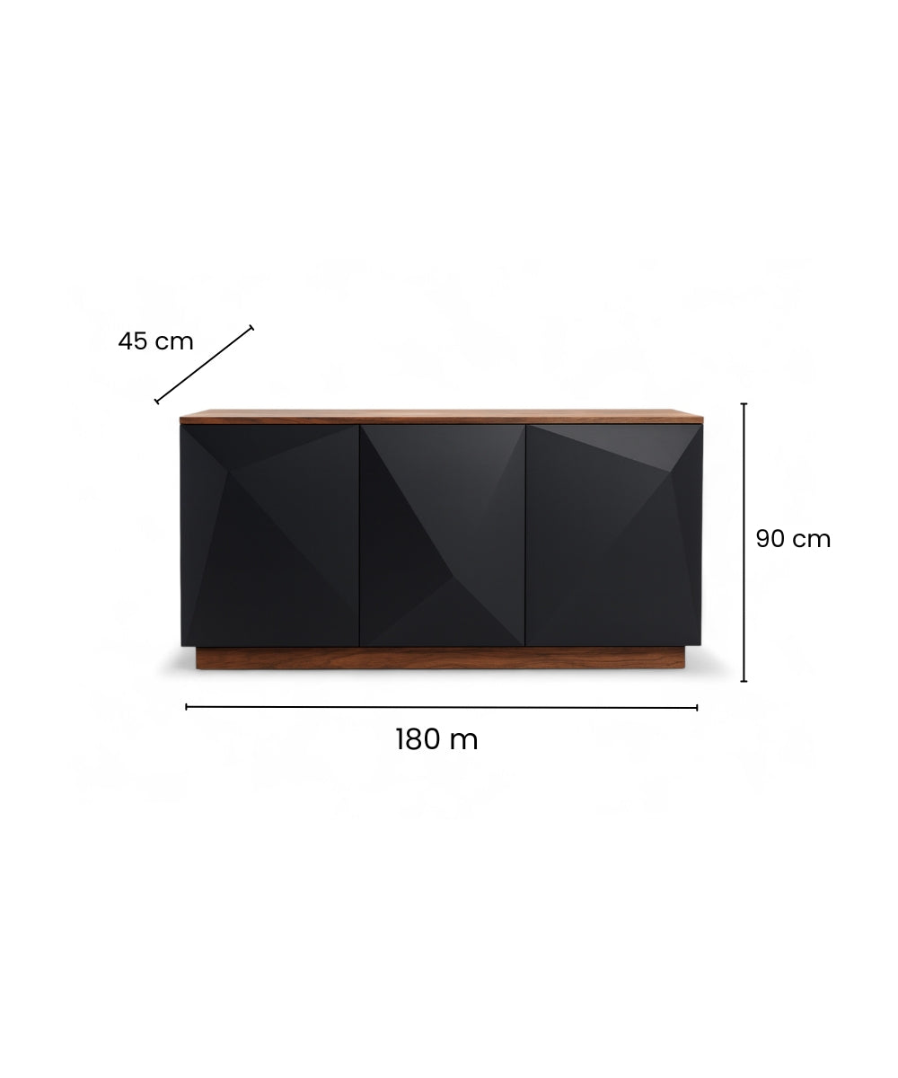 La bufetera Alpes combina modernidad y elegancia con un diseño geométrico en acabado negro que aporta sofisticación. Su cubierta y base en madera de conacaste contrastan con las puertas, creando una pieza funcional y decorativa ideal para realzar espacios contemporáneos.