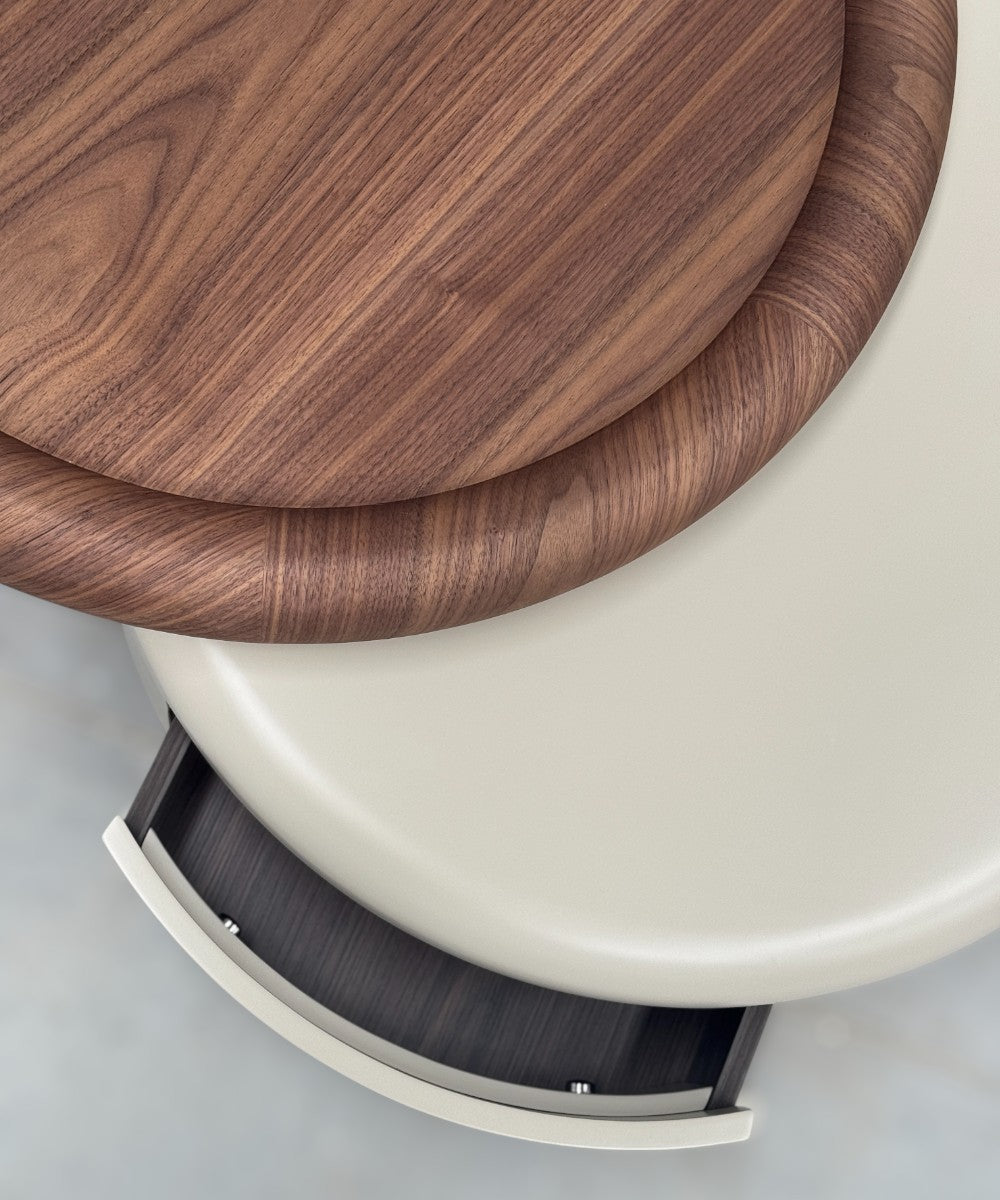 La mesa Tavos está fabricada con top en madera 100% de fresno y destaca por su cubierta redonda con bordes suaves y un diseño deslizante que permite extender la superficie según la necesidad. Su base curva aporta estabilidad y una estética moderna, ideal para salas contemporáneas.