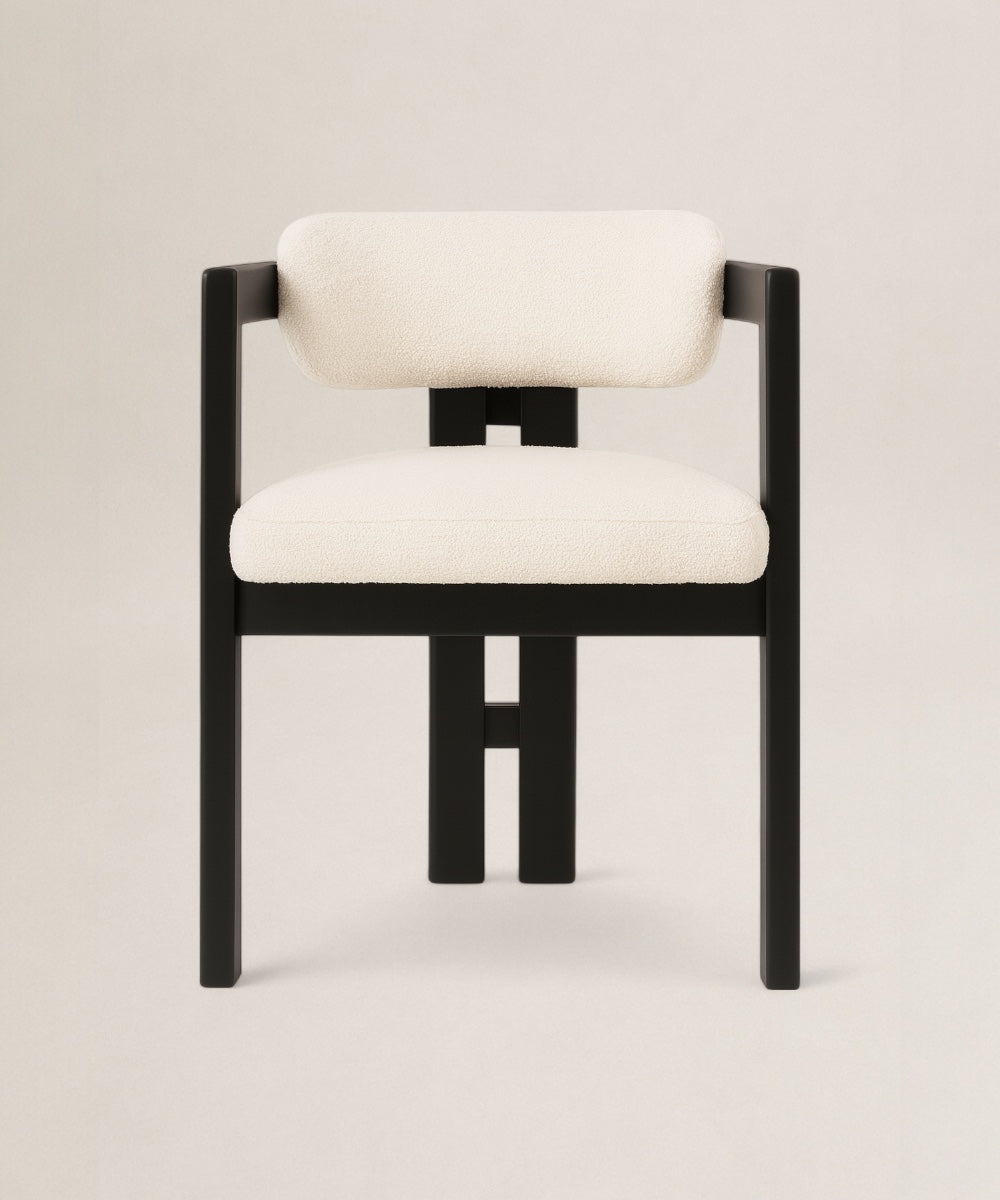 Diseño geométrico con un respaldo flotante y estructura sólida. Sus uniones visibles y proporciones equilibradas reflejan un estilo artesanal con un toque contemporáneo.